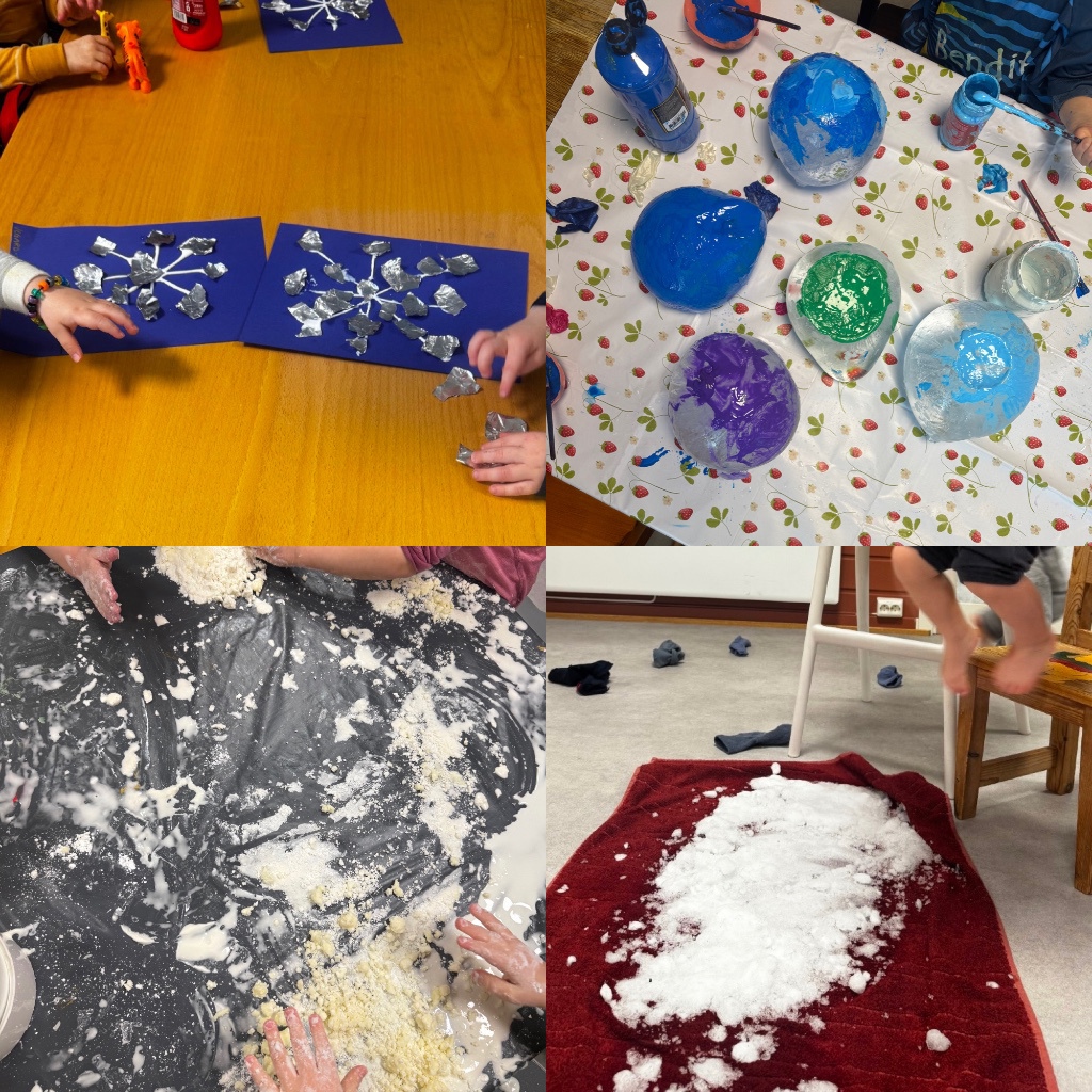 Sist men ikke minst har vi laget vinterbilder og snøfnugg bilder. Vi voksne hjalp til med å lage snøfnuggene med lim, mens barna limte på alluminumsolje som var klippet i små biter.