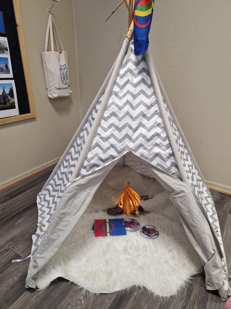 Vi satte opp en liten Tipi på avdelingen , som blei flittig brukt av barna til rollelek. Mange reinsdyr på avdeling akkurat denne uka ;)
