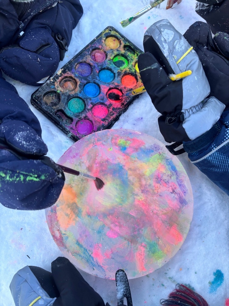 Barna har også fått vært med på å fryse ned vann i bøtter, melkekartonger. Disse isklumpene har vi testa ut hvordan det var å få maling på. I tillegg blei vi opptatt av hvordan isen såg ut innvendig. Masse fine mønster. Snodig fenomen :)